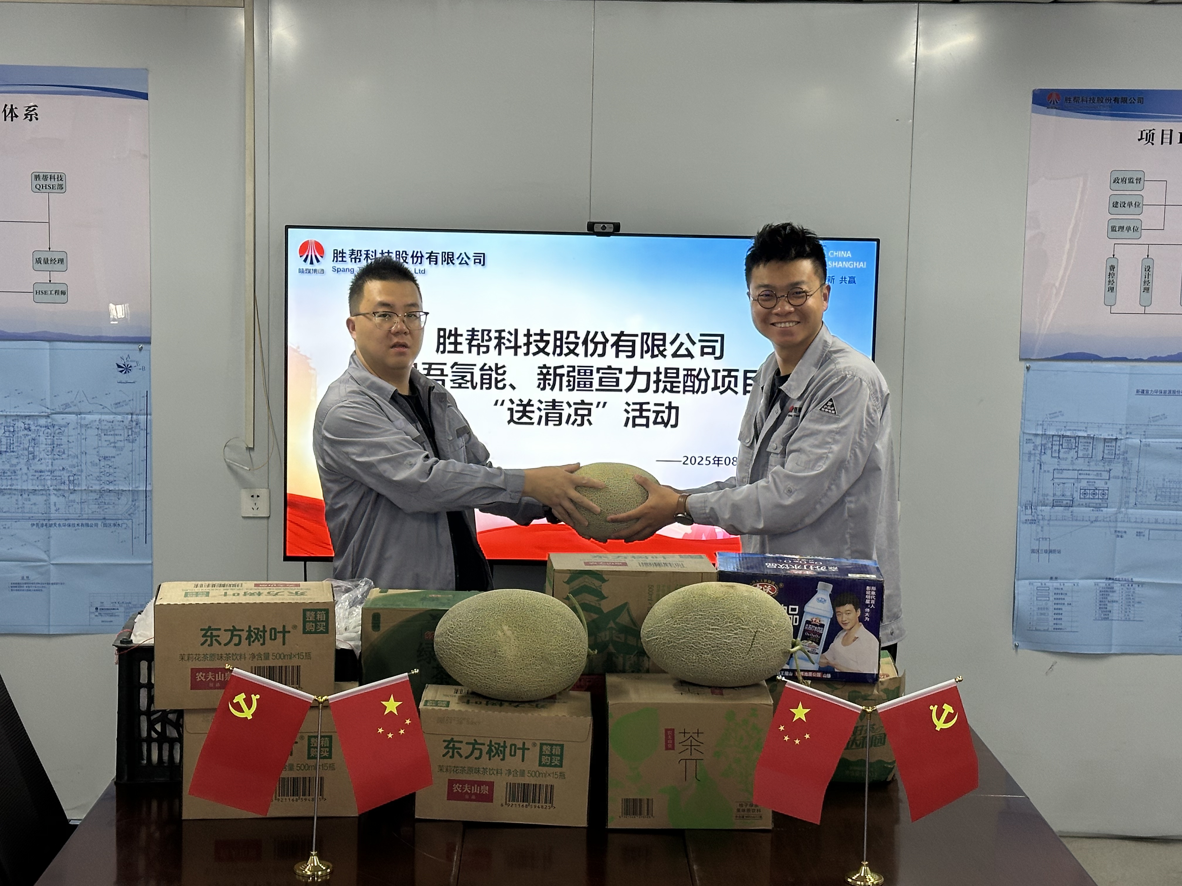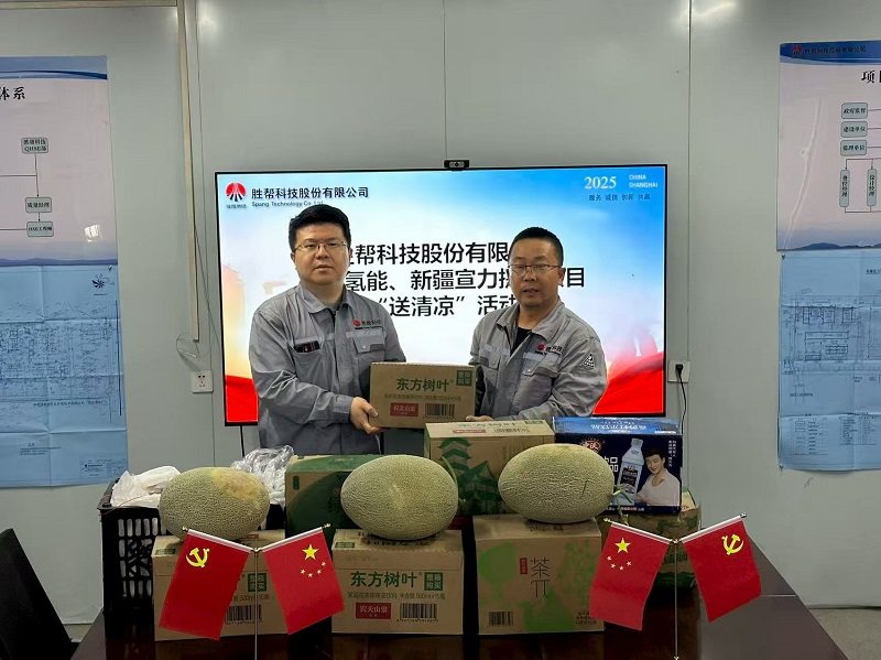 時值盛夏,驕陽似火。為切實做好高溫季節(jié)員工關(guān)懷工作,保障項目一線員工的身心健康與安全生產(chǎn),2025年8月11日,勝幫科技股份有限公司副總經(jīng)理盧貝、項目經(jīng)理張浩一行,冒著酷暑,不遠(yuǎn)萬里,專程抵達(dá)勝幫科技位于新疆哈密淖毛湖地區(qū)項目現(xiàn)場,代表公司親切慰問奮戰(zhàn)在艱苦環(huán)境中的一線員工,并組織開展“夏日送清涼”活動,為員工們送去公司的深切關(guān)懷和絲絲清涼。